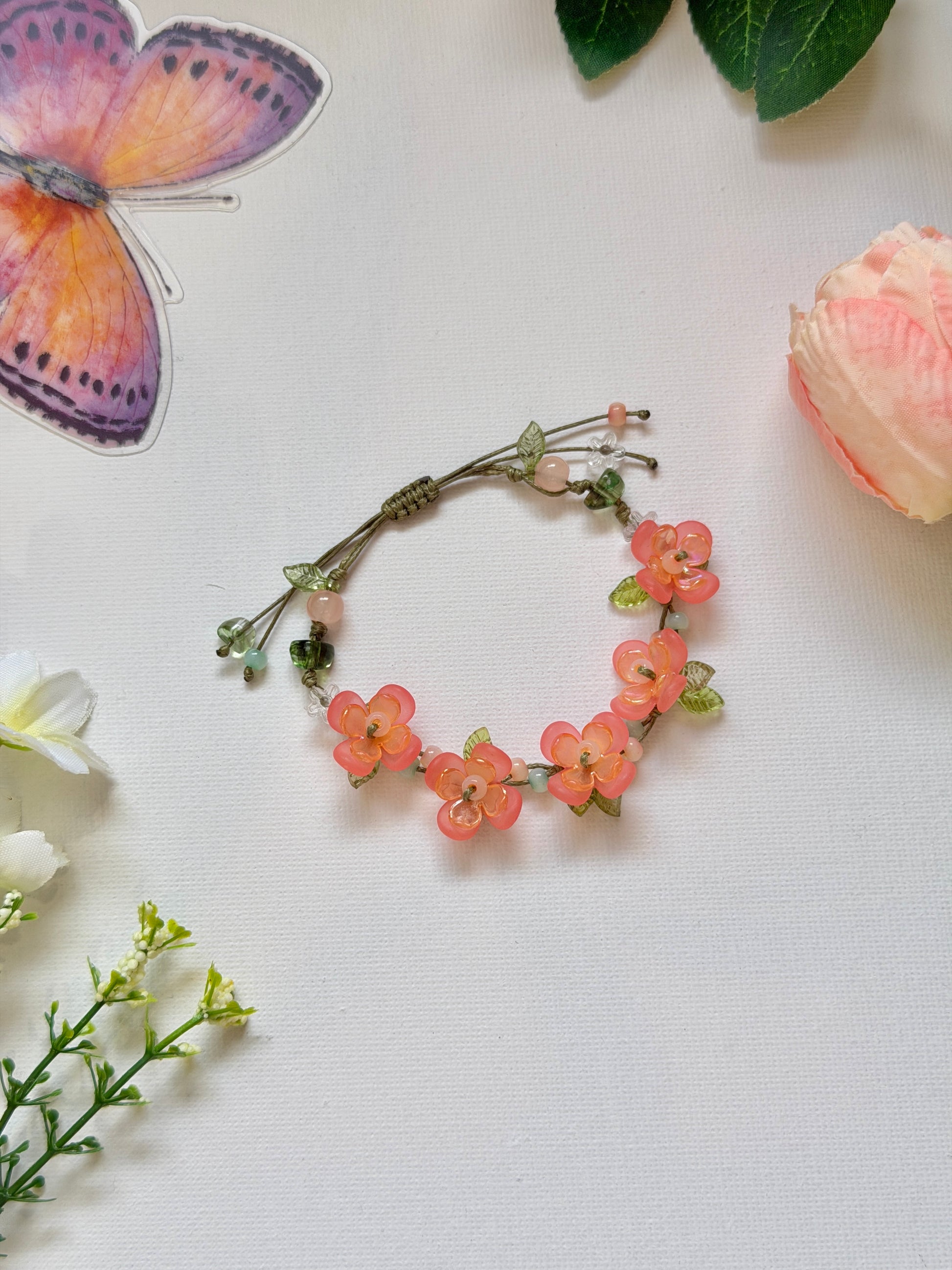 🌿 This handmade bracelet features orange flowers